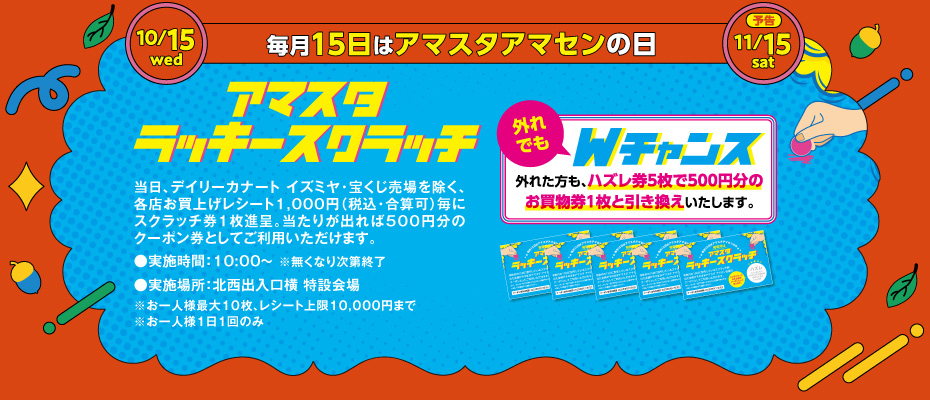 当日、デイリーカナート イズミヤ・宝くじ売場を除く、 各店お買上げレシート 2,000円以上(税込・合算可)のご提示で1回抽選いただけます。