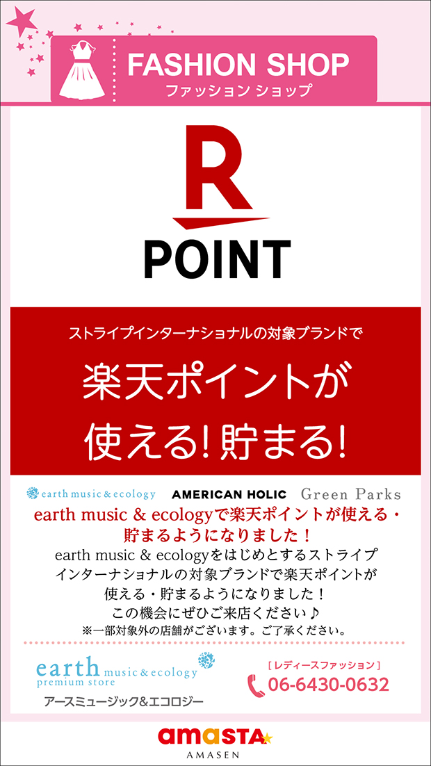 earth music & ecologyをはじめとするストライプインターナショナルの対象ブランドで 楽天ポイントが使える・貯まるようになりました! この機会にぜひご来店ください♪ ※一部対象外の店舗がございます。ご了承ください。