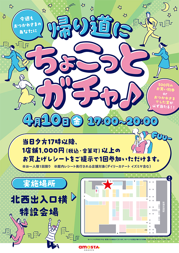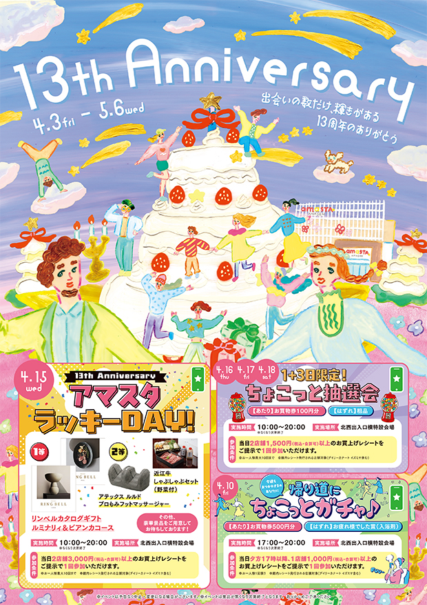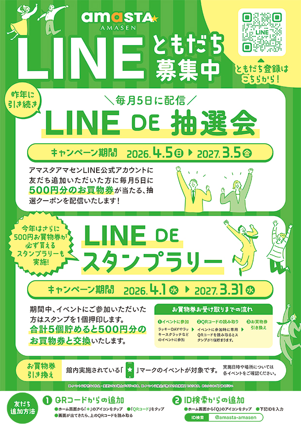 アマスタアマセンLINE公式アカウントに友だち追加いただいた方に 毎月5日に500円分のお買物券が当たる、抽選クーポンを配信いたします!