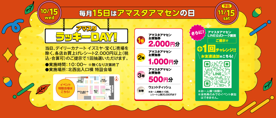 当日、デイリーカナート イズミヤ・宝くじ売場を除く、 各店お買上げレシート 2,000円以上(税込・合算可)のご提示で1回抽選いただけます。