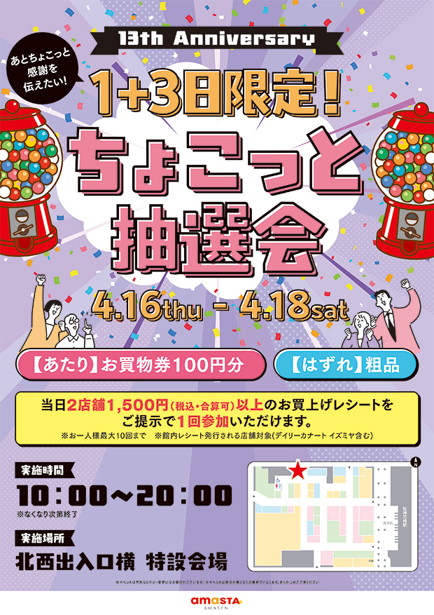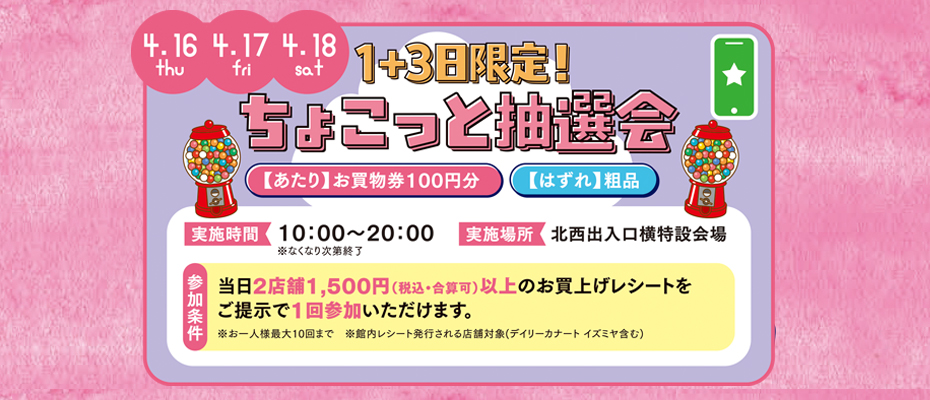 当日2店舗1,500円(税込・合算可)以上のお買上レシートをご提示で1回参加いただけます。